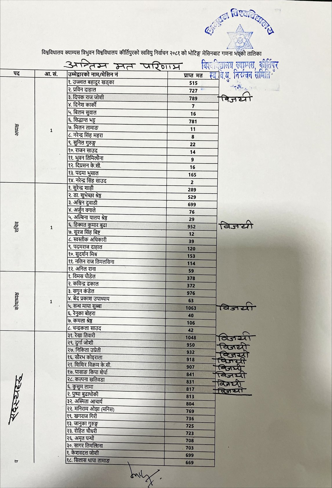 त्रिभुवन विश्वविद्यालयको केन्द्रीय क्याम्पसका रुपमा रहेको यस विश्वविद्यालय क्याम्पसमा मिति २०८१ चैत्र १८ गते स्वतन्त्र विद्यार्थी युनियनको निर्वाचन, सम्पन्न भएको छ। उक्त निर्वाचनका लागि दर्ता भएका जम्मा २२ वटा संघ/संगठन/समूह मध्ये प्रत्यक्ष तर्फ ११ वटा संघ/संगठन/समूहले निर्वाचनमा भाग लिएका थिए। यसै गरी स्वतन्त्र रुपमा अध्यक्ष पदमा ३ जनाको उम्मेदवारी परेको थियो भने सचिव पदमा ४ जनाको स्वतन्त्र उम्मेदवारी परेको थियो। उक्त निर्वाचन सम्पन्न गर्न विश्वविद्यालय क्याम्पस, प्रिन्सिपलको कार्यालयले नेपाली केन्द्रीय विभागका विभागीय प्रमुख प्रा.डा. कृष्णप्रसाद न्यौपानेलाई निर्वाचन अधिकृतको जिम्मेवारी दिएको थियो भने उहाँको नेतृत्वमा ११ सदस्यीय निर्वाचन समिति गठन गरिएको थियो। उक्त निर्वाचन २०८१ चैत्र ५ गते हुने गरी मिति तोकिएको भएता पनि प्रिन्सिपल कार्यालयमा भएको तालाबन्दी तथा उच्च अदालत पाटनमा परेको रिट निवेदनका कारण उक्त मितिमा निर्वाचन सम्भव हुन नसकेको हो। तर मिति २०८१ चैत्र १५ गते उच्च अदालत पाटनबाट रिट निवेदन माथि सुनुवाई पश्चात ने.वि.संघको आधिकारिकता टुंग्याइदिएपछि निर्वाचनको वातावरण तयार भई चैत्र १८ गते स्वतन्त्र, निष्पक्ष र भयरहित वातावरणमा निर्वाचन सम्पन्न भएको हो।