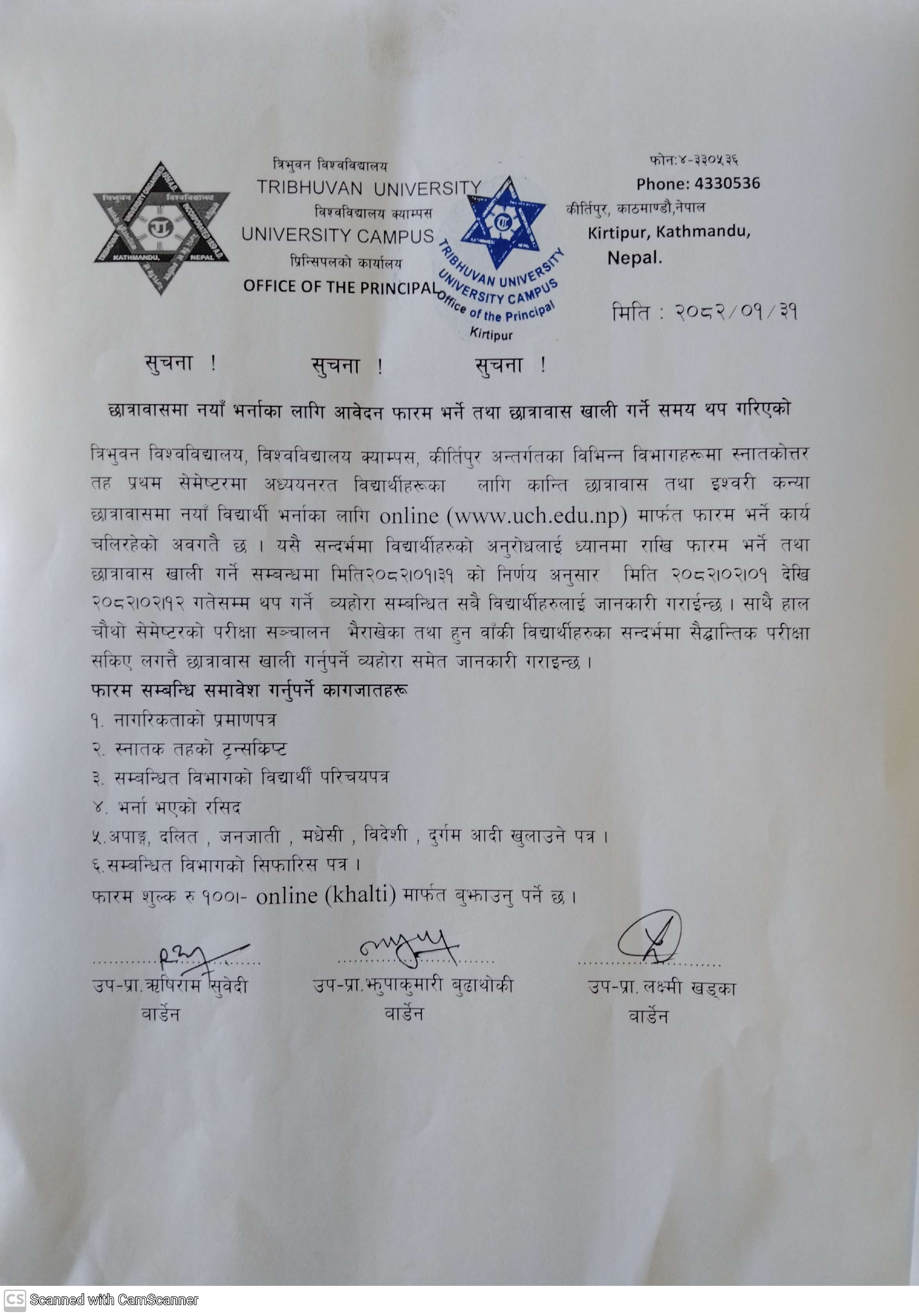 छात्रावास अावेदन फारम काे म्याद थप सम्बन्धी सूचना ।